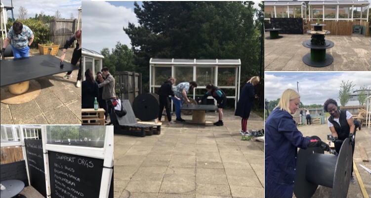 The students made furniture using items that were destined for landfill – wooden pallets, electrical cable drums, and trees that had been felled and were going to be used as firewood. They created large chalkboards to display information on local mental health support groups, and they made yoga areas and chill-out spaces.